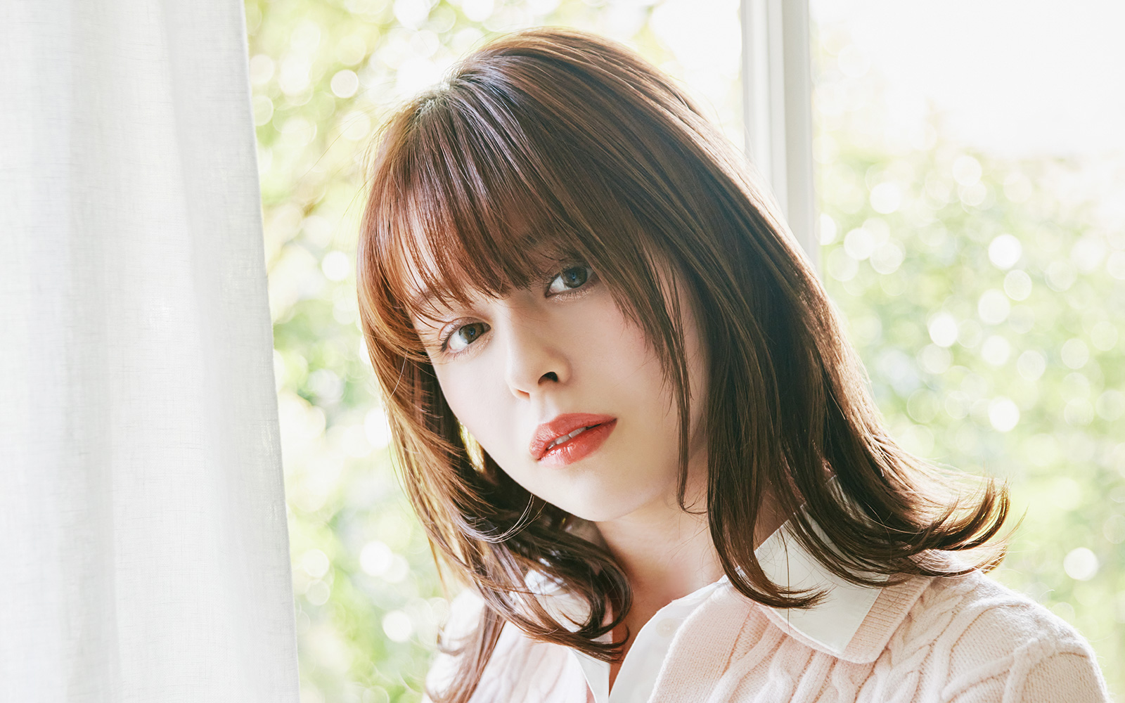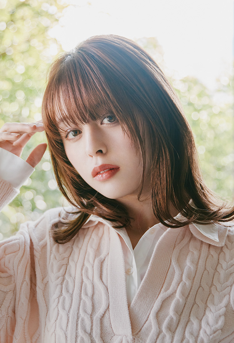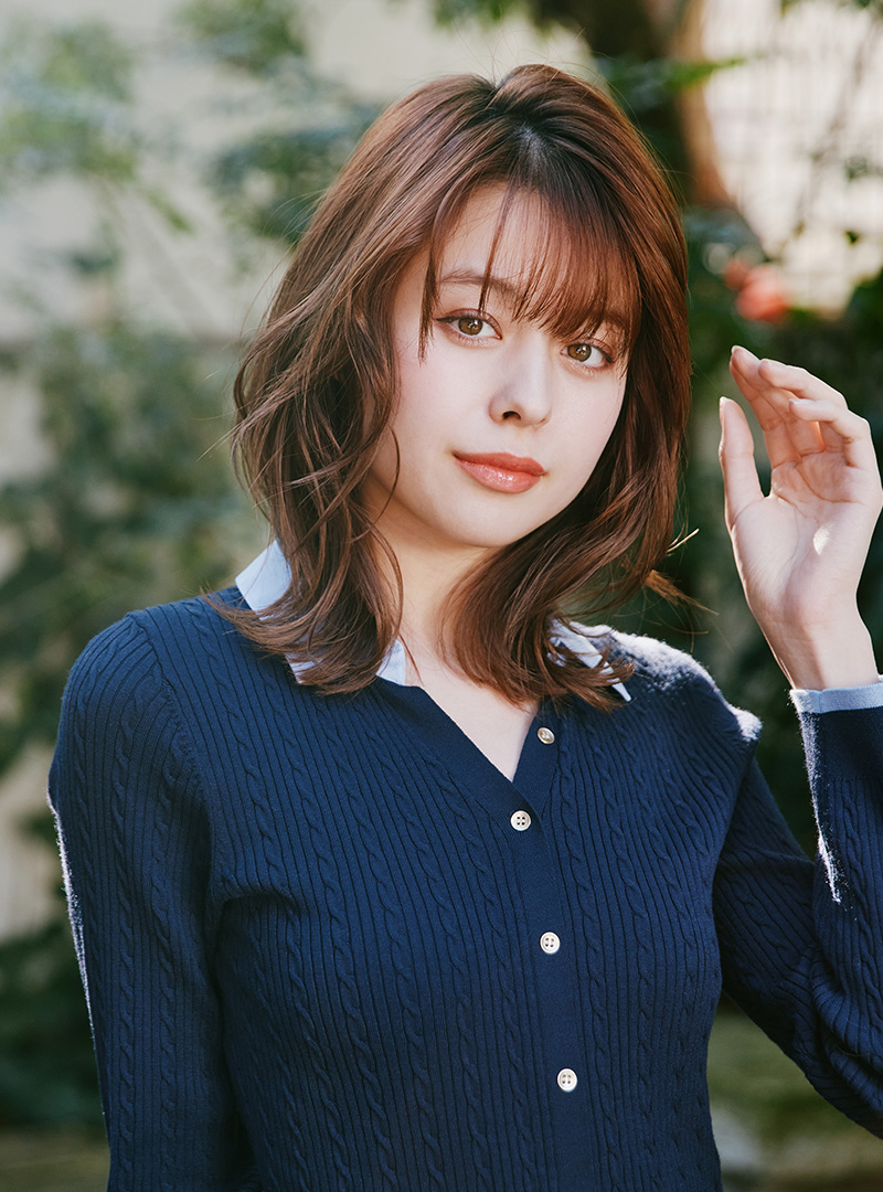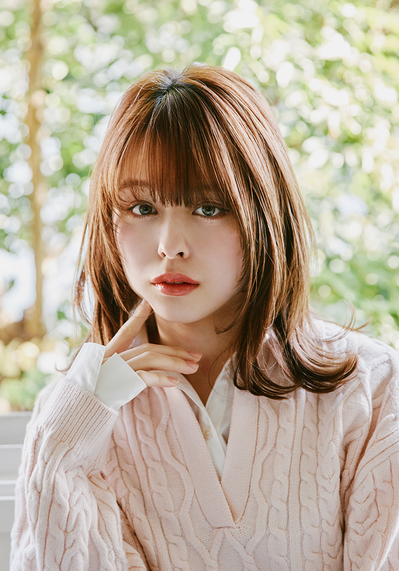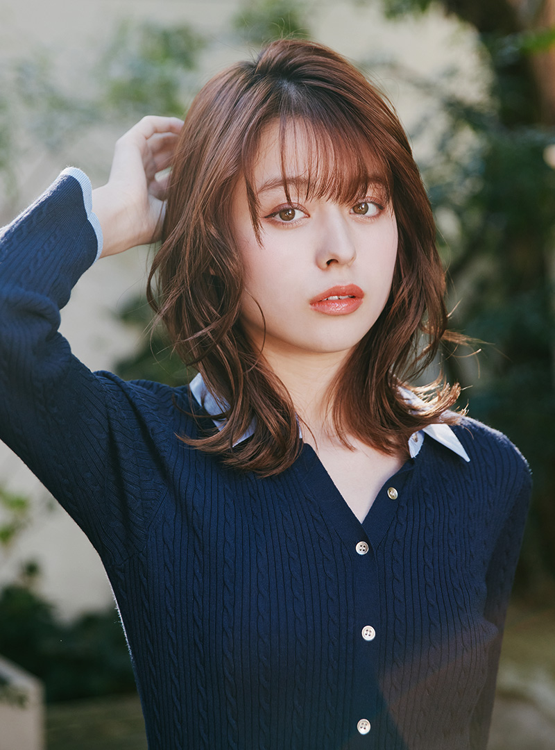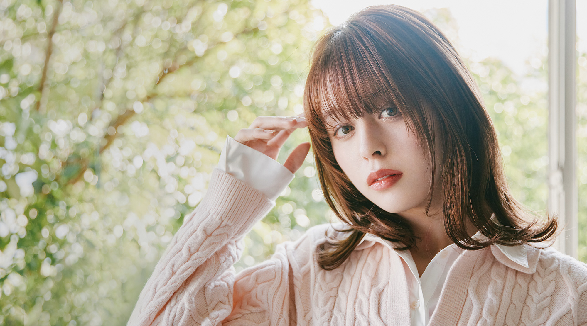 前髪と全体をランダム巻き。バームとオイルでシルエットを整え、前髪はスプレーで立ち上げる。全体的にふわっと仕上げることでこなれた印象のスタイルに。