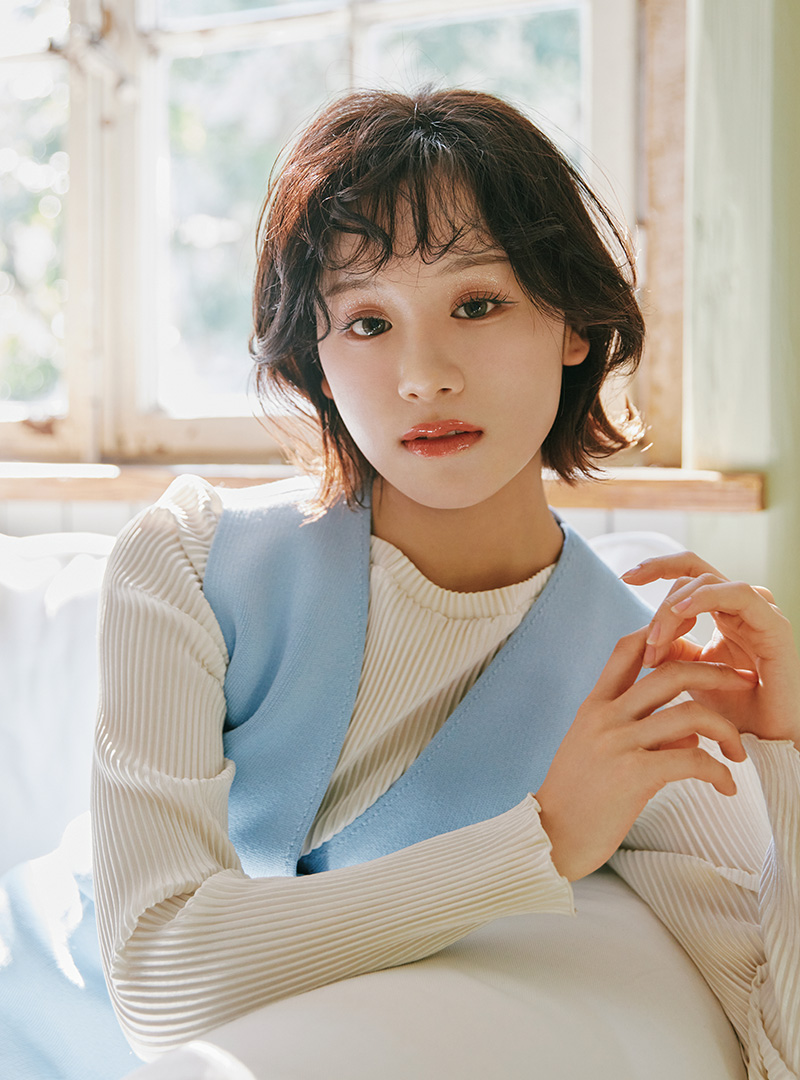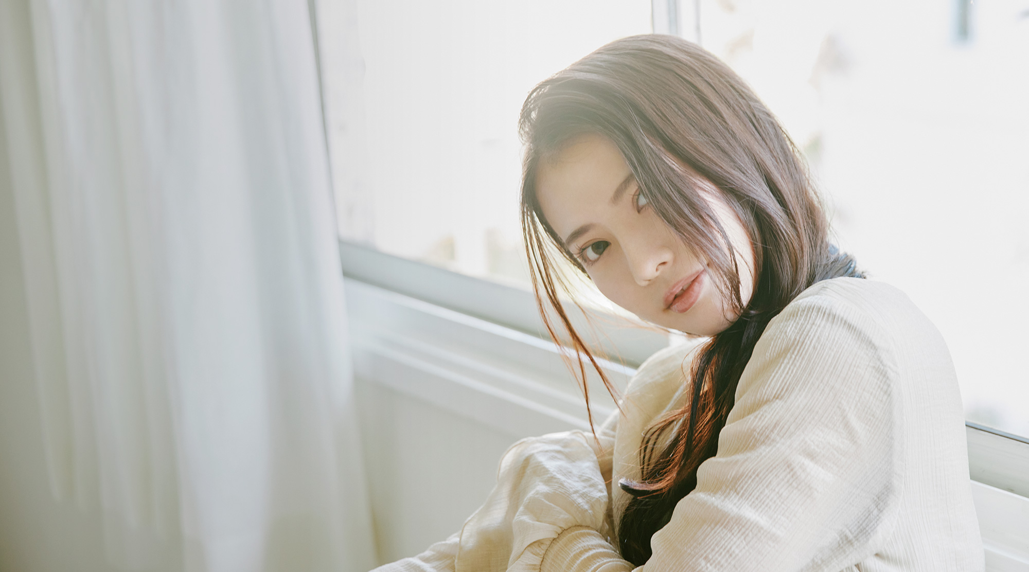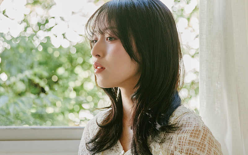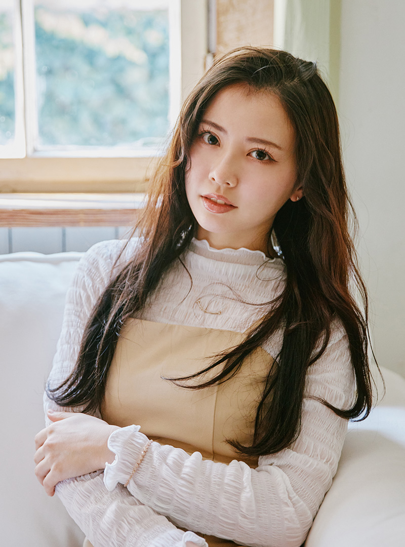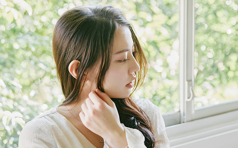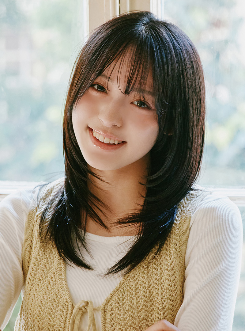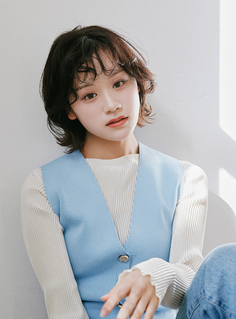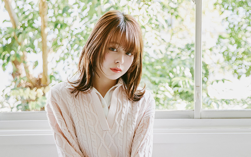 コテで毛先を外ハネにして、顎下にはくびれを作る。軽めのオイルを全体につけてシルエットを整える。外ハネ×くびれで流行りのY2Kスタイルに。